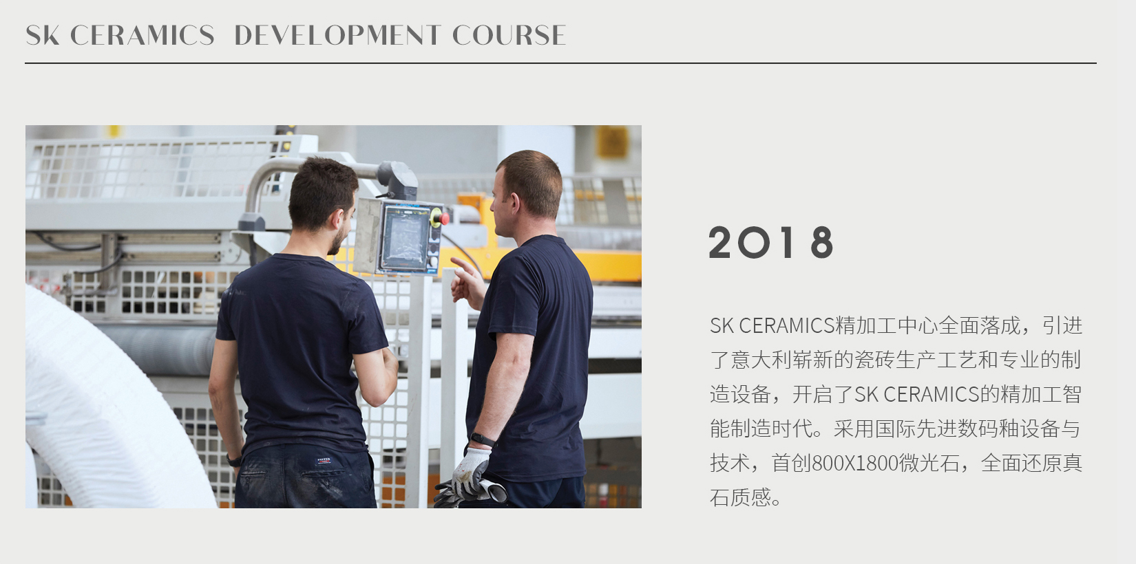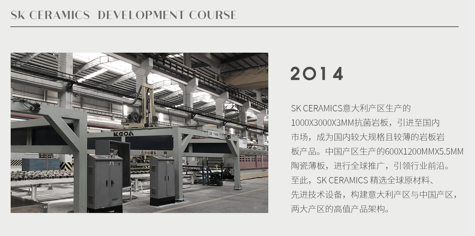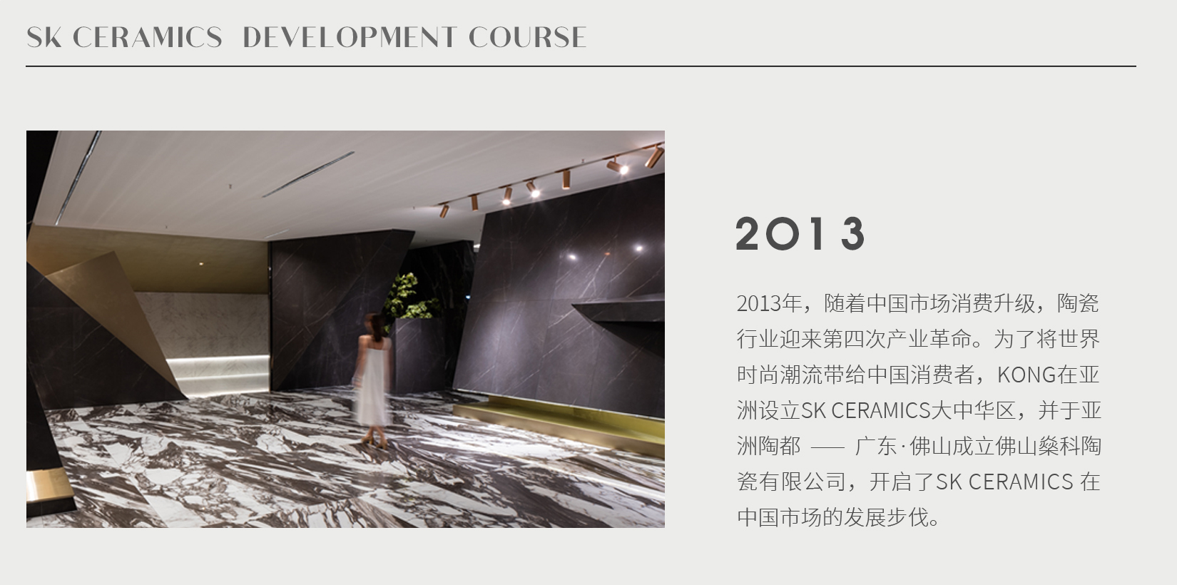 2013年,隨著中國(guó)市場(chǎng)消費(fèi)升級(jí),陶瓷行業(yè)迎來(lái)第四次產(chǎn)業(yè)革命。為了將世界時(shí)尚潮流帶給中國(guó)消費(fèi)者,Kong在亞洲設(shè)立SK ceramics大中華區(qū),并于亞洲陶都——廣東·佛山成立佛山燊科陶瓷有限公司,開啟了SK ceramics 在中國(guó)市場(chǎng)的發(fā)展步伐。